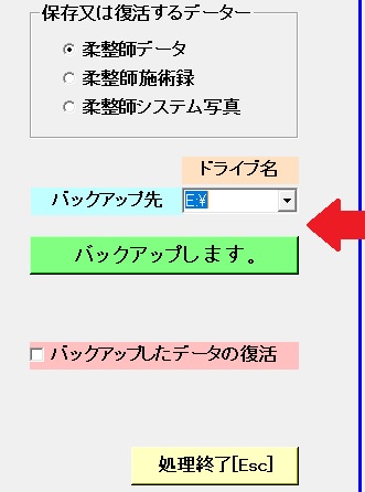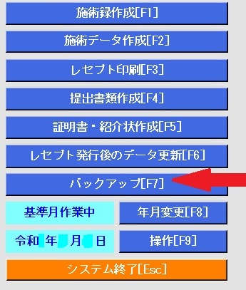 パソコンの故障等によるデータ損失を防ぐため、データの【バックアップ】をお勧めしています。  また、治療所のPCのデータを【バックアップ】して自宅に持ち帰り、自宅のPCでデータの【復活】をすることで、自宅でPC作業をすることができます。