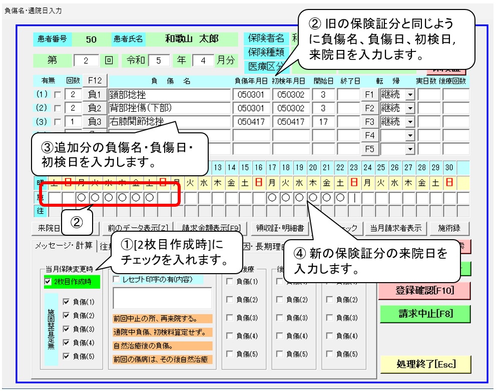 ② 旧の保険証分と同じように負傷名、負傷日、初検日,来院日を入力します。