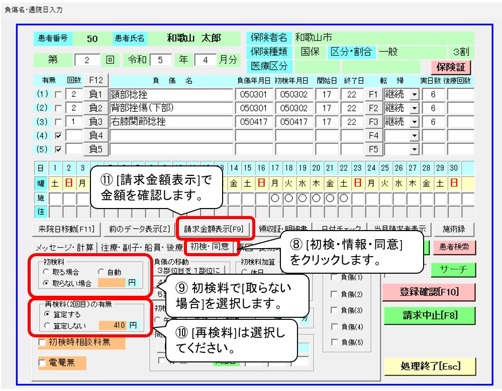 ⑨ 初検料で[取らない場合]を選択します。