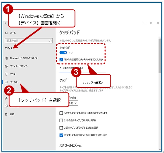 ノートパソコンの種類によっては、Windows設定にタッチパッドを有効にする項目がない場合があります。