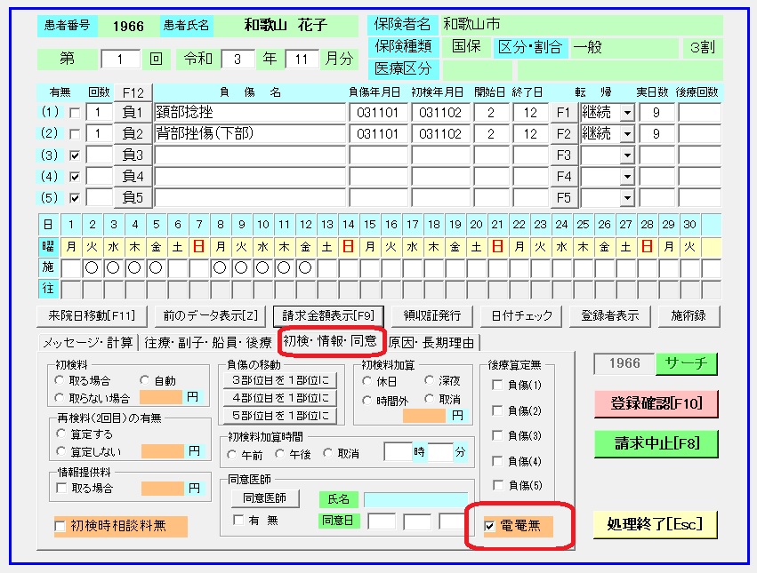 2021年11月24日 / 最終更新日 : 2021年12月24日 twinhillssoft 施術データ作成 柔整・電療料を算定しない時 ①メインメニュー→[施術データ作成]→[負傷名・通院日入力]→該当者を表示してます。 ②「負傷名」「負傷年月日」「初検年月日」を入力後、[初検・情報・同意]をクリックします。 [電罨無]にチェックを入れます。 ③[請求金額表示]で「電療料」・[温罨法料]に金額が入っていないか、確認して登録してください。
