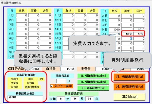 「日計処理」→「領収証兼明細書」の発行ができます。